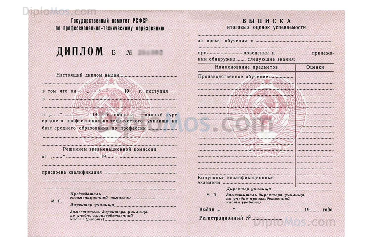 | Диплом училища СССР до 1994 года. Полный комплект, диплом в наличии. Гознак |